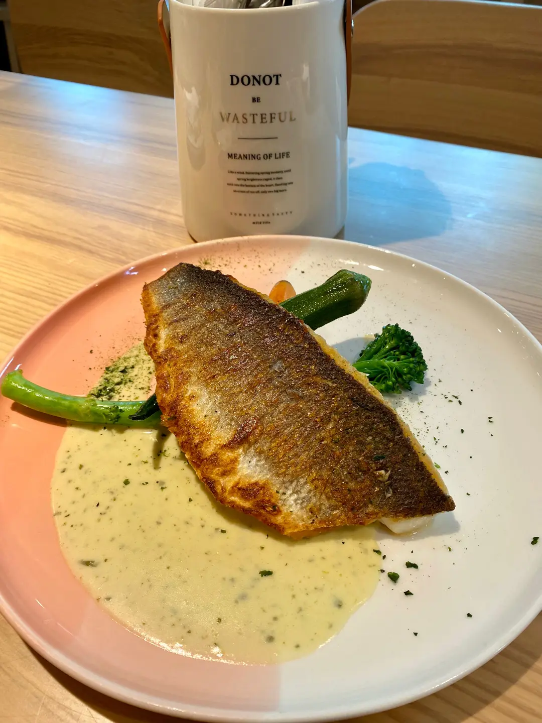 香煎鱸魚柳配秋葵紫蘇忌廉汁