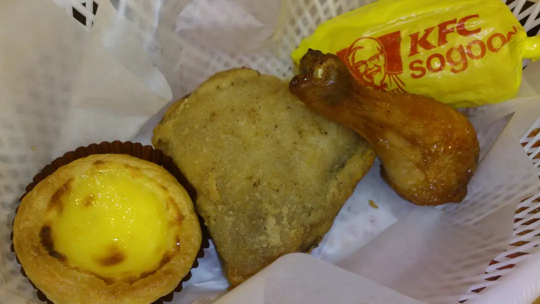 Egg tart, KFC, roasted drumstick, cobette