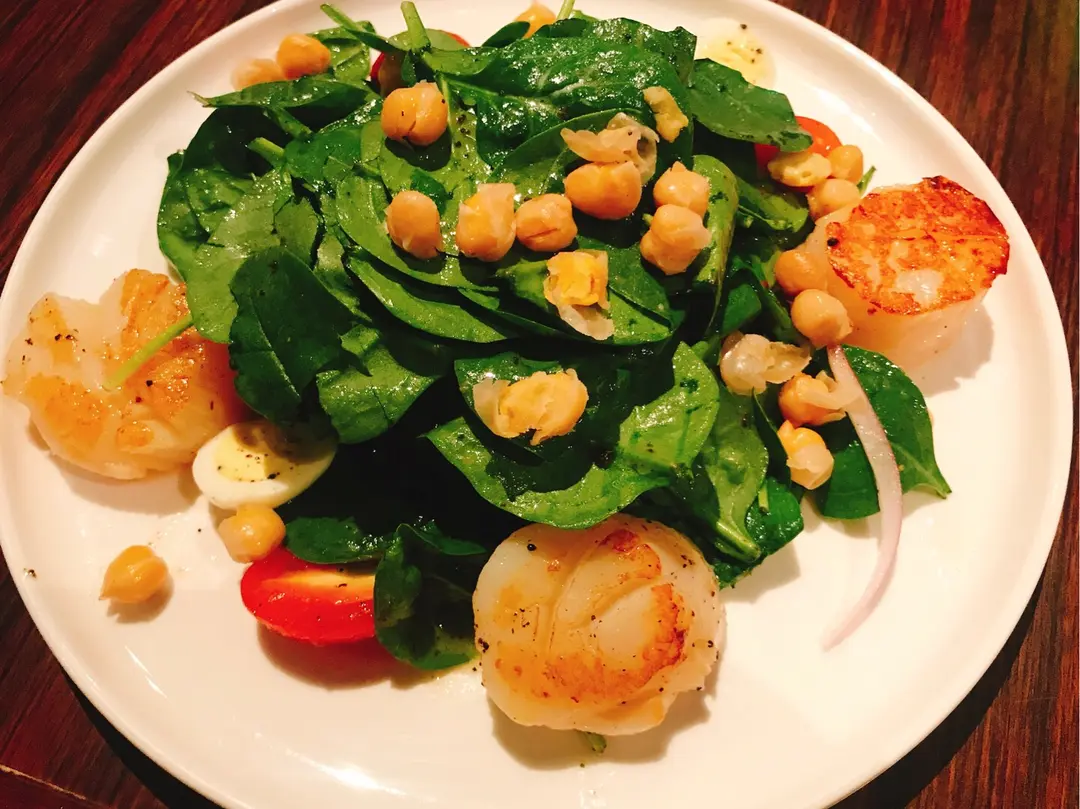 煎北海道帶子鷹咀豆嫩菠菜,鵪鶉蛋沙律配黑松露菌油醋汁