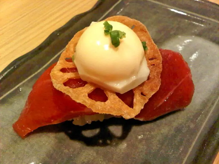 . Tuna / Lotus chip / Quail sushi * .