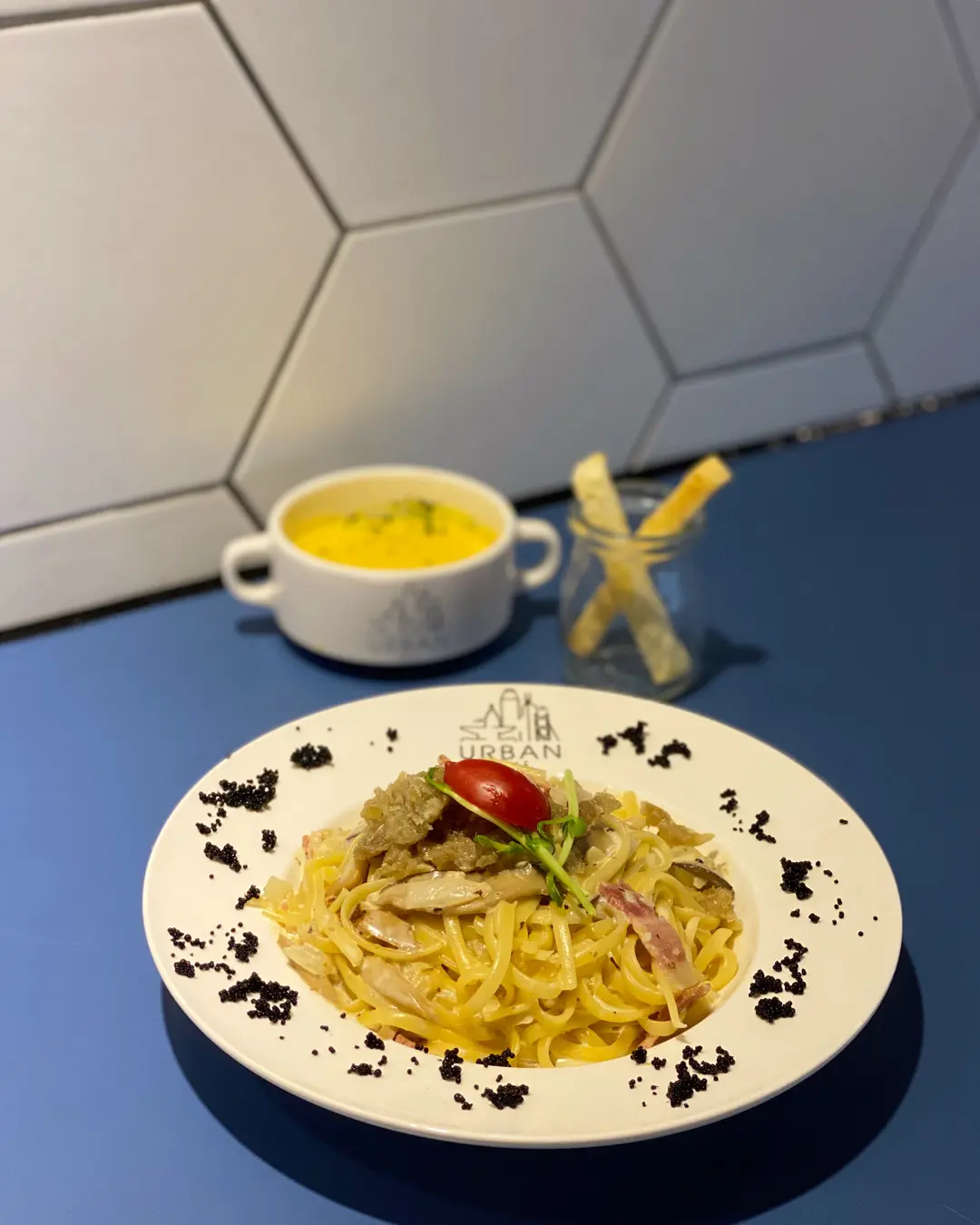 Lunch • 日式黑蟹籽拖羅茸卡邦尼扁意粉
