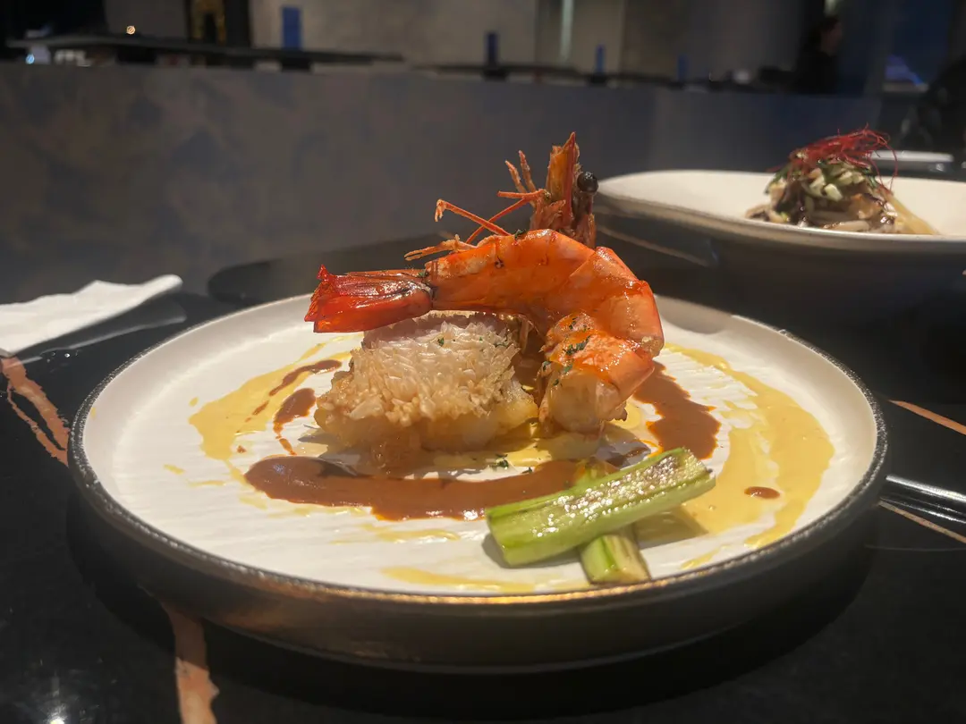 香脆魚皮金鯛魚配虎蝦、檸檬蛋黃龍蝦汁