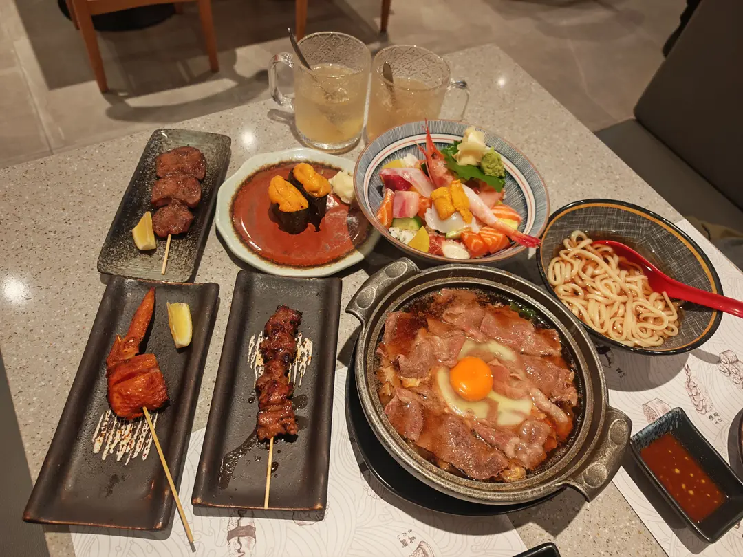 海膽軍艦、牛舌芯、牛肋、明太子雞翼 、味噌湯、沙律、安格斯牛肉壽喜鍋、湯烏冬、雜錦角切魚生丼、雙色雪糕紅豆抹茶凍、意式咖啡雪糕