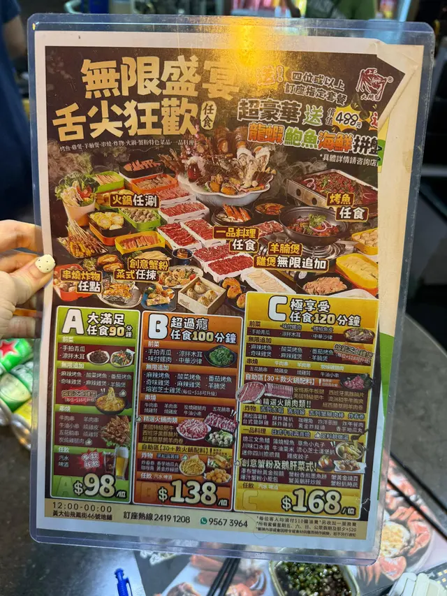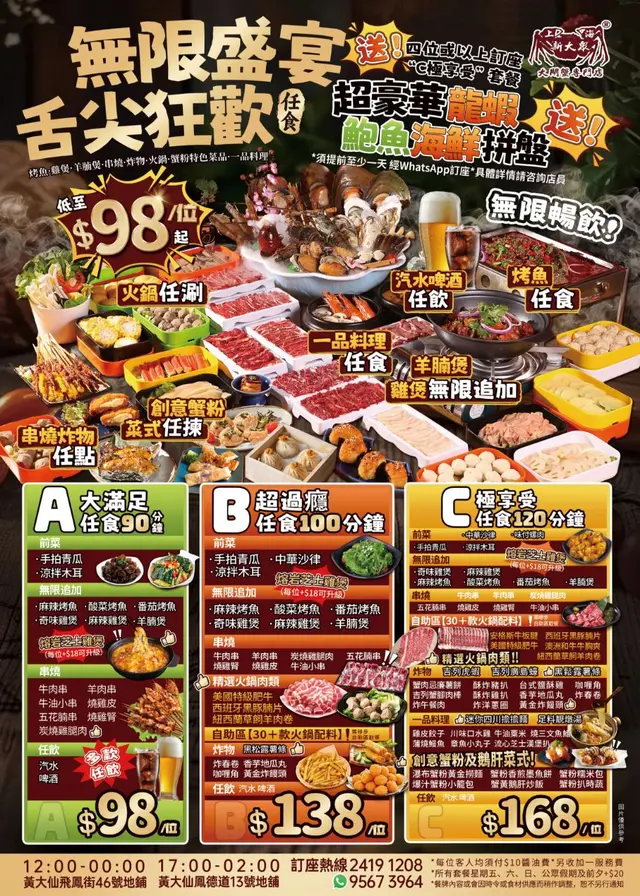 餐廳:上海新大眾大閘蟹專門店 (黃大仙)地址:黃大仙飛鳳街46號地舖最近去咗東南亞旅行半個月,一返到香港除咗掛住港式茶餐廳之外,就喺打邊爐同放題😋,而咁啱就比我喺黃大仙搵到間性價比極高、晚晚都坐爆棚嘅放題餐廳——上海新大眾大閘蟹專門店,星期一至四平日最平$98加$10醬料費同加一服務費就食到90分鐘放題,而我今次就叫咗最貴嘅$168「極享受」120分鐘放題,就算我星期日去食埋單都喺$218一個人,真心抵到爛😍原來餐廳開咗8年,前排仲喺同區開埋分店,本身主打大閘蟹🦀,最近新推出咗放題,有齊雞煲、羊腩煲、烤魚、火鍋、串燒、炸物、一品料理,同最特別嘅蟹粉同鵝肝菜式任食🤤,仲有幾十款啤酒汽水同韓國飲品任飲🍺,而四個人以上訂座指定套餐仲送龍蝦鮑魚海鮮拼盤,難怪晚晚都大排長龍,唔訂位我諗都真喺無機會食得到😂坐低無耐先叫咗個奇味雞煲,喺印尼峇里島食完嚡熠熠嘅雞肉,返到嚟就食到嫩滑惹味嘅鮮雞件真喺一大樂事🐔,雞嘅份量都幾多,本身諗住食埋羊腩煲最後都費事怕食唔晒所以無叫到,邊食雞煲嘅同時就喺點餐紙叫咗一堆串燒同蟹粉美食嗌咗牛肉串、炭燒雞腿肉、燒雞腎同羊肉串🍢,串燒偏向濃味同埋加咗孜然粉,放入口依然熱辣辣🔥,食完最啱飲返罐生百事可樂解渴同消吓氣🥤。蟹粉小籠包充滿肉香同肉汁,不過唔喺好食到蟹粉,反而蟹粉扒時蔬同瀑布蟹黃金撈麵就比到我好大驚喜,蟹粉新鮮而且夠多,食落每啖都有滿滿嘅蟹粉香味,仲要真材實料因為我食到一粒仔蟹殼😂,可惜太飽無機會試埋蟹黃鵝肝炒飯,決定下次一定要過嚟試吓值得一讚嘅喺炸物一啲都唔馬虎,食咗個黃金炸饅頭同吉列廣島蠔,兩款都喺即叫即炸,入口鬆脆香口,廣島蠔仲要爆汁💦,平時鍾意食炸嘢嘅人,一定要叫返一兩樣嚟試吓👍雖然環境細細,座位之間有啲逼夾,但我食完之後終於知道點解呢度每晚都咁多人幫襯😎…查看更多