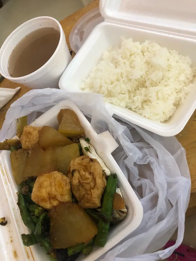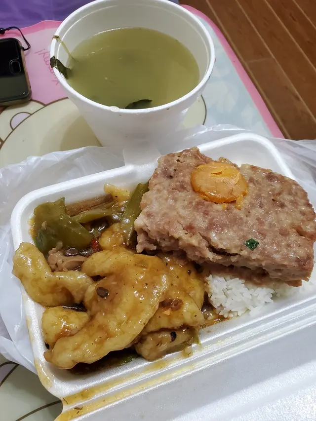每次行經佳記都一定見到有人排隊買飯盒因為確係大件夾抵食既餸菜款式選擇都算多的今次叫左少飯,所以飯得一半肉餅唔太咸夠大件涼瓜魚塊亦美味其實只食餸都已經夠晒飽不過我最鍾意碗湯,完全無味精的其實店內阿姐唔算無禮貌只係真係太忙唔會下下對客人笑最緊要係清楚講出指出想食咩等阿姐快快手盛好菜餸就可以了查看更多