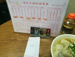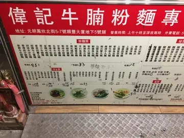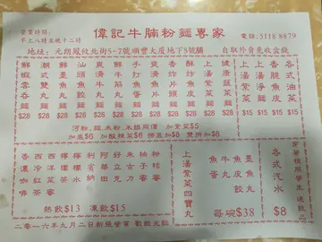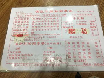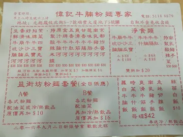 偉記門口是馬路,馬路邊有個渠有時會傳出陣陣臭味,所以附近人會稱偉記做臭記。不過今日無臭味,一於試下。從門面想像裏面地邊尚算乾淨,坐茶餐廳的圓凳。餐廳標示價錢牌十分混亂,混亂到一個點完全看不明白甚麼粉麵配甚麼價錢,所以點餐前還是先問一下店員避免誤會。唯獨以下黃色價錢牌清晰亮眼。我們點餐當日因爲是假期,所以點餐前還是問一下店員有沒有振撼價。結果是有特價餐。所以我們還是點了。兩碗牛膀河,面加16元多碟油菜加飲品。所以一碗麵轉套餐。麵沒有因為$20碗而細碗。份量一樣是很足夠。而牛膀其實沒有很入味。湯底亦不是很突出美味。油菜份量正常。美味雖稱唔上,但是今時今日香港重有$20/碗麵是很難得。雖然好多人都說倒貼$20都唔食偉記。我倒不是這樣想。中學生中午$20食碗麵可以草多一點零用錢。我覺得$20碗麵可以慳一點錢。總之$20碗麵對很多人來說可能是甘露。…查看更多