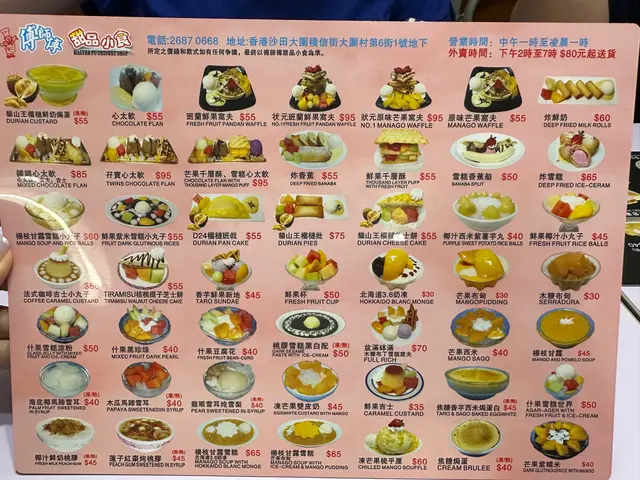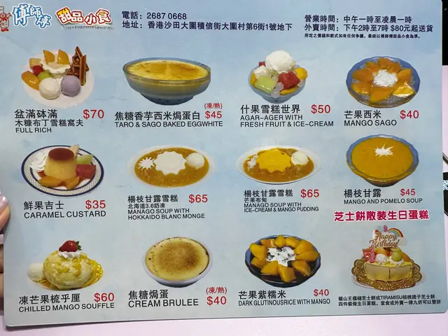 傅師傅甜品小食 (大圍) 網址: https://s.openrice.com/QrbS0WZO000 地址: 香港大圍大圍村第六街1號地舖 電話: +852 26870668