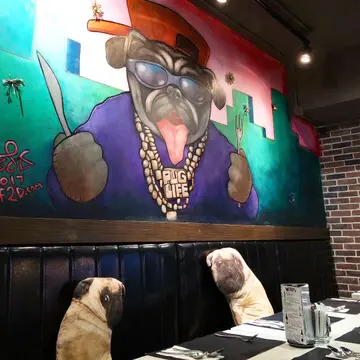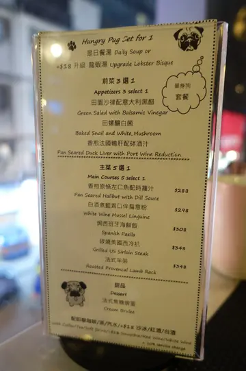 尖沙咀食肆日新月異,每月基本上都有新餐廳推出。😖😖所以尖咀區要搵食確實不是一件難事。而一間餐廳要做得有特色,「話題性」非常重要。🧐🧐🧐是日晚上與友人兩個來到「八哥主題餐廳hungry pug cafe」🐶🐶原以為店內是以寵物狗仔陪伴共餐,實際卻是以八哥為主打設計重心🥰🥰一進店內基本上所有看到既裝修都用左八哥設計,「牆身」- 一張超大型八哥人型噴畫,已感到一刻驚喜,而店內更有多個狗仔咕臣,非常得意🥰🥰🥰食物方面似乎已經不是重點,與友人點了八哥燒骨,很老實說味道麻麻,肉不是即叫即焗,反而是先煮熟再焗,入口肉質頗硬😅😅 另外點了黑松露薯條亦只是普通粗薯加黑松露醬,創意分大減🤦🏻♂️🤦🏻♂️ 其實黑松露配搭的西餐款式都蠻多,感覺有點求其。一直去到甜品,終於救了餐廳一命,「八哥立體慕絲」賣相絕對俾100分,太像真太特別,友人狂拍照慶祝😂😂如分店於食物上再花功夫,絕對會再光顧😋😋