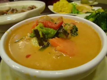 媽媽牛一飯放棄傳統中菜, 改選大家也喜歡的泰菜,從搜尋結果中看到這家區內較新的泰菜館似乎蠻不錯, 拍板決定生日吃泰菜。預先致電訂檯,誰知平日晚上的德政圍是如斯人少, 附近一列食肆同是人客不多,跟不遠處的屯門市廣場裡人山人海景況真的很大差別。一踏入門口表明已訂位,貌似主理人的男仕已能道出我的姓氏,可能是晚就只有我訂位吧。店內沒有什麼華麗裝潢,是較地道的泰菜館形式;全店都以木製桌椅, 我們的是較舒適的有椅背座位,其他的是古式板凳, 很有客棧風味唷,要是供應農家菜則更貼題。桌上幾張過膠餐牌包含了越南及泰國菜式,選擇上算得較為多元化,幾款套餐在價錢上是比較優惠,不過還是單點的較對味。壽星要吃的火車頭檬粉真的相當大碗,如小面盆似的湯碗上放上滿滿的材料,細數下有牛肉片、札肉及蘿蔔,札肉如常的爽口,時令蘿蔔煮得透心無渣及甜美,這款配菜最得我心,相信用作煮蘿蔔的湯底也是清甜好飲,牛骨味雖不太濃郁仍是不錯之湯底水準。蝦醬炒飯以三片泰式腊腸及炒蛋略作裝飾,外觀也好看很多,炒飯炒得不多油,除那三片腊腸外,還有不少腊腸碎混在飯內,其味道跟中式腊腸類似,甜甜又油油的味道令炒飯有點腊味飯影子,泰國菜炒麵飯中常有的紅色小蝦數量也不少,只是很難從舌頭上感到牠們存在,反而豆角粒的爽脆卻平衡了飯粒軟綿感,令炒飯沒那麼糊口,用得很好的配菜,所用蝦醬味道未夠勁道,不然這道菜可以做得更濃香的。自己的海南雞飯比想像中大堆頭,泰色蒜汁蒜味夠強,不過還是少吃為妙!充滿黃油的泰式海南雞肉煮得夠滑,雞皮也有點彈性,意想不到牠竟有點像娘親煮的白切雞味道,雞肉吃來不是無味爛布雞,意外水準! 油飯黃得不太自然,從顏色來看不只有雞油還用了黃薑來煮,不然那會黃得那麼耀目飯粒跟炒飯般軟,可是無論雞油香或香茅香也不濃,外表像油飯味道是白飯的米飯是不符合我對油飯的要求耶。雞飯配冬瓜湯一碗,大冬瓜瓜皮部份還未煲淋,難得遇到有嚼勁的冬瓜,湯底有點雞味,不過又有蠻重胡椒粉的味道,泰國是這樣煲冬瓜湯的嗎煩請指教。細佬很想吃咖喱,再點一個紅咖喱牛肉,咖喱汁很香椰汁味微辣程度絕對老幼皆宜,加有香葉的咖喱汁裡還有車厘茄、西蘭花及椰菜花,用來配飯也夠均衡,吃掉牛肉及蔬菜還有很多美味咖喱汁,不要浪費食物之下決定.......配一客蒜蓉包,幾片烘得金黃香脆大大片法包上抹上勁多蒜泥及牛油,十個吸引!!牛油勁香不過又吸收了很多牛油,不管了!法包非常夠脆,蘸了咖喱汁更加好吃的,兩者是絕配唷!!現在每餐除水果還要多吃蔬菜,泰菜必吃的椰菜苗不能缺少,今次選了惹味的鹹魚同炒,可是上桌時鹹魚不見了變了蒜茸,香氣當然不及鹹魚來炒啦。菜苗幼嫩炒得帶爽口,水準是可以的,再點一款泰式炒雜菜,款式是椰菜、西蘭花、椰菜花、秀珍菇、芥蘭及小蕃茄,真的蠻雜菜!幾款蔬菜也很新鮮,可是味道比剛才的蒜蓉椰菜苗更清淡。當我們吃到杯盤狼藉之時,疑似主理人男仕問我們吃不吃芒果黑糯米因要時間準備!愛吃這甜品的壽星當然不錯過! 雙色糯米飯皆柔軟中有韌勁,又以紫米的煙韌度好一點,很有糯米香,最怕吃到軟到夾不起的飯糊狀糯米了!椰汁有椰香卻不太甜,以冬天時間,店方所選的芒果水準還好, 金黃甜美的芒果為糯米飯變得更像甜品一點。細佬點的青檸梳打,以原支泰國玻璃瓶梳打水泡製,餘下的也連瓶上桌,豪氣!細佬說初期有點甜味,再加入梳打水則變淡,以經驗來看應另行加了檸檬汽水才有甜味吧,基本這款梳打水是無味的嘛。要不是打敗仗,我也要來一個椰青或青檸梳打,現在只有熱得燙咀的熱茶,苦~~~~埋單$321, 價錢是不貴,不過味道未算很出色,好處是坐得舒服,只因客人不多,店裡不吵也不迫狹,只可惜來價問題,是日沒有最吸引的乳豬,不然這生日飯更加精彩。…查看更多