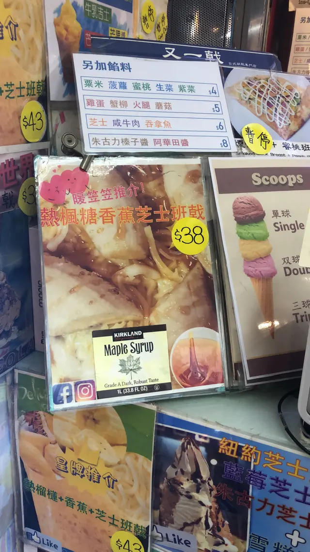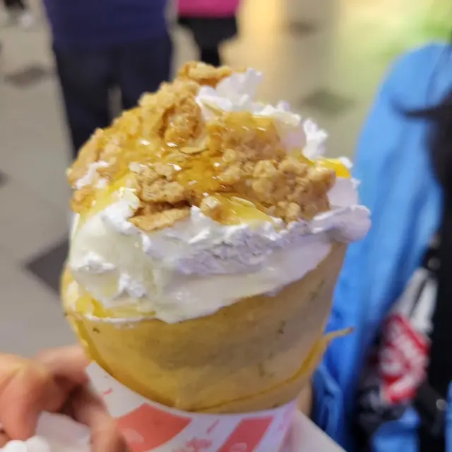 又一戟的椰子味我並沒有很鍾意食班戟, 但這裡實在太人氣了, 所以不由自主第一時間便衝向這間。我和細姨都一致同意選店長推介的乳酪班戟。玄米茶我都好想試的, 但都試的話一定飽到可以回家了。然後我們行埋一邊傾計, 後來才發現原來已經叫過我們了。店長好好人, 幫我們重新再做, 大方的男人就是最型的啊。班戟即煎即用, 放上乳酪雪糕一大球,然後是木槺燕麥﹑蜜糖漿, 唧上忌廉在邊, 然後又再來一球雪糕, 這樣重覆疊上去, 做出來好高,好大杯, 如果有四個人一齊食就最好了。佢個雪糕好好食, 好似土耳其雪糕般有點黏力, 是我沒有食過的味道, 應該不是用粉劑, 因為它不是軟雪糕,而是實淨的,味道亦不似是各大品牌雪糕, 加上木槺燕麥和蜜糖漿,好好食。忌廉可不吃, 因為是甜忌廉, 班戟我都可以不吃, 其他各部份都是出色的。店長推介果然得!…查看更多