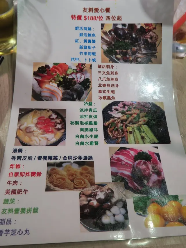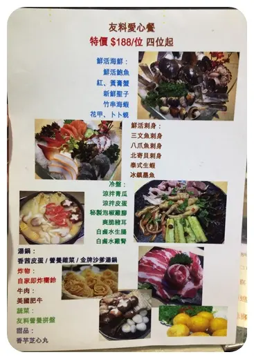 打邊爐,真係一年四季都不會悶!今次有朋友車我哋入土瓜灣,話帶我哋食好嘢!咁當然就一窩瘋跟過去啦~~ 呢度仲要係良心企業!每日都會派發飯給有需要的人。很多義工都有參與。 呢度啲位都幾寬闊,坐係度打邊爐都會比較舒服~~ 我哋一行六人,點咗個「友料愛心餐」每位都係HK$188!呢個餐係For四人的,之後我哋再點多其他嘢。 首先,當然係要食返個刺身先啦~~ 呢個係餐入面所包的。呢個刺身份量,又堅係好恨大份呢~~~~~ 五款刺身包括:泰式生蝦、北寄貝、肥美三文魚、八爪魚以及冰鎮墨魚。最愛當然是肥美的三文魚了!真的鱒甜且油脂剛剛好! 再黎涼菜冰盤,很大份!說是四人份量,真的很難相信!又係餐入面的哦!有6款嘢食,當中包括:涼拌青瓜、泡椒雞腳、涼拌皮蛋、爽脆豬耳、白鹵水生腸、白鹵水雞腎。 這個涼菜拼盤,少有地款式好多。而且辣得黎好過癮。最愛豬耳,十分爽脆!又好鬼彈牙!個皮蛋都好正!食咗啲辣汁,辣得好有層次! 打邊爐湯底,揀咗「營養雜菜鍋」!啱晒女人們啦!好多蔬菜,清甜湯底,無油最正! 全場最正,當然係呢個海鮮盤!!超大盤,而且款式都好多哦~~ 成6種海鮮,包括鮑魚、膏蟹、蟶子、海蝦、花甲同埋卜卜蜆。 蟶子雖然細細隻,但係隻隻都好鮮甜味美。而卜卜蜆是我最愛,鮮味十足!愛蟹的朋友,不容錯過膏蟹哦,都好多膏啊~~還有大大隻的鮑魚~~ 我哋仲額外點了呢個必食推介!食到想再叫多一煲,真係超級正!「澳門蒜香卜卜蜆煲」HK$148 堅係成煲上,大大煲的。而且卜卜蜆的份量超~~~多的。粒粒都肥美飽滿,食起上黎有著勁量香的牛油以及惹味的蒜香。加上了白酒,醠添味美!辣中帶酒香,加埋入晒味的金菇,超正! 火煱料方面,有這個本寶丸重難月日粒粒都非同凡響!包括:榨菜牛丸、咸蛋豬肉丸、墨魚粒墨魚丸、芝士蝦丸等。睇下個芝士蝦丸,堅係唧晒啲芝士出黎架! 美國肥牛,質素也不錯,份量都幾大。如果想再食好啲,加差額補個安格斯肥牛都得! 必食自家製的即炸響鈴!新鮮炸起,唔點湯,點醬食,好鬼正!極脆,鬆化!好正! 姬㭃茸瑤柱響螺燉冬瓜雞湯鍋HK$188 成班女,最緊要係滋補,當然要食呢個鍋!極濃極滋補的湯料。好好飲,而且不會油,火喉勁足!一定要黎試下! 友料雞煲海鮮火鍋土瓜灣土瓜灣道237號益豐大廈A地舖