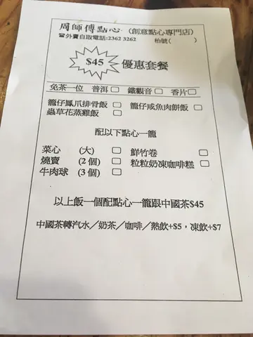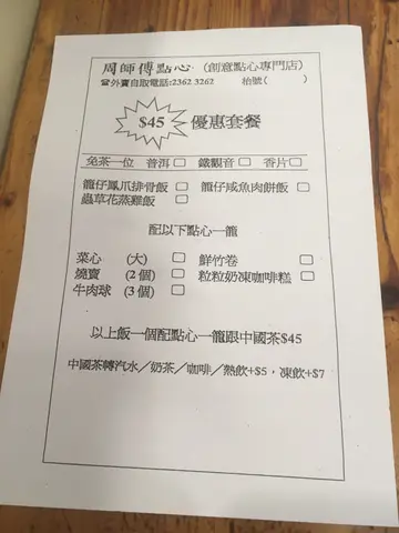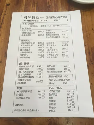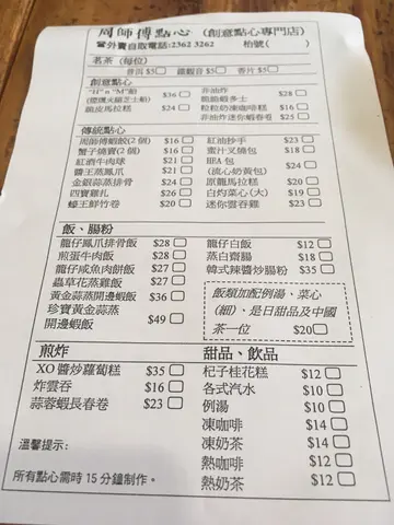 五個人3點幾黎食點心,帶左三個老人家一齊黎試下!整體黎講,啲點心全部都熱辣辣,即叫即蒸,老人家表示滿意。但係咩都要趁熱食,食得有啲急。周師傅蝦餃$17因為得返一籠,只有兩粒。本人無食,屋企人試下。佢哋認為唔太好食!一夾就散,皮太厚,蝦細細粒,介乎鮮蝦同蝦乾中間!脆皮馬拉糕$24佢有傳統嗰款同脆皮哩款,我哋想試下新質地,所以揀左脆皮!脆皮哩款偏乾身,如果想食鬆軟嘅蛋糕,揀傳統應該會比較好!迷你蝦春卷$25真心太迷你,食唔到入面嘅餡係咩,只知咸咸哋!金銀蒜蒸排骨$25哩碟好食!上枱時,感覺新鮮熱辣之餘,排骨彈牙,易離骨!下面仲鋪左芋頭,又入味,又夠粉!XO醬炒蘿蔔糕$37小心俾上面嗰片辣椒呃左,其實唔辣㗎。聞落好香,但食落無咩XO醬味。就咁食件糕係有蘿蔔香,點埋後加嘅辣醬比較好食。乾脆叉燒包$24一上枱姨姨就話「哩個要襯熱食!」我哋都唔敢怠慢,快快手清左佢。個包比較實同厚身,老人家話應該係粉太厚,所以口感普通,包幾「痴」牙。Hae 包$26即係流心奶黃包,都係一籠兩粒。一打開,有滿滿嘅餡。奶味重,鍾意食奶會喜歡嘅!蟹子燒賣$16蟹子就係燒賣上面嘅分量咁多,哩款燒賣係豬肉餡。肉質彈牙,無岀面嘅燒賣咁油,味道ok!蟲草花蒸雞飯(套餐)$45上枱時,大家都有細細聲咁讚歎!佢唔係盅頭飯,係籠仔上,飯下面仲鋪左荷葉!飯嘅分量都幾多,五個人,每人都食到一小碗,仲可以有剩。套餐可以加一份點心,仲要免茶芥。我哋食嘅時候,已經見左四位男仕自己黎食哩個餐。點心我哋揀左菜心全走!迷李雲呑雞$23個湯有兩粒雲呑,兩片雞,加少少菜。湯清甜,雞夠滑但又唔係「林」到唔使咬,雲呑係豬肉餡。粒粒奶凍咖啡糕$16有少驚喜!咖啡味好岀色,屋企人話似齋啡,加埋少甜奶凍,剛剛好。連唔食奶嘅屋企人都係咁叉咖啡部分黎食。結:選擇唔多,但勝在新鮮岀爐。屋企人話可以再黎試其他嘢!…查看更多