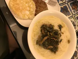 係元朗搵左間冰室食早餐,冰室有2層,空間都幾迫,由於下層已經坐滿左,我地上左去上層。上層空氣有少少唔流通。叫左個雪菜米,漢堡扒同煎蛋。味道不過不失,熱朱古力就比較淡味,價錢都幾幾實惠$30幾蚊食個早餐,好多地方都做唔到。