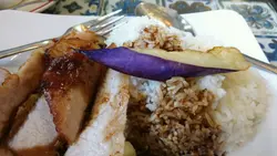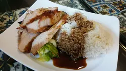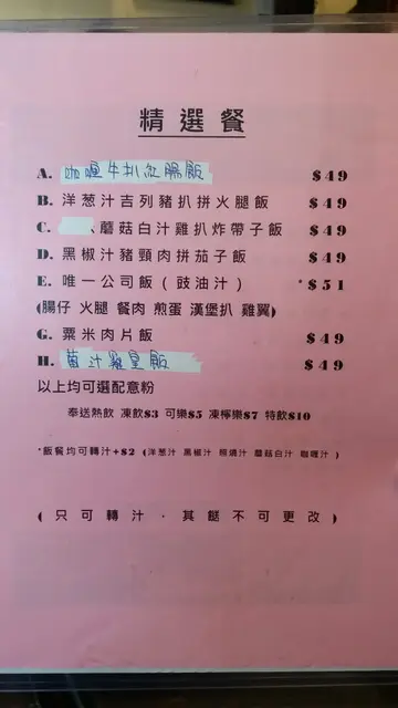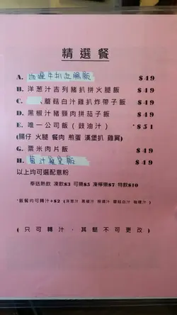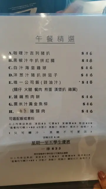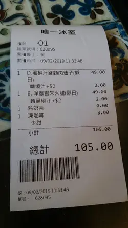 呢日一行二人嚟到元朗建業街嘅《唯一冰室》食個 bunch。揀咗精選餐入面嘅照燒汁豬頸肉拼茄子飯配熱奶茶 及 黑椒汁吉列豬扒拼火腿飯飲凍咖啡,一共$105。照燒汁豬頸肉拼茄子飯 - 豬頸肉外面帶少許香脆,肉質爽口,夠入味;茄子走油後顏色十分漂亮,口感軟熟。照燒汁味道亦相當唔錯。唯一美中不足係飯比較硬身,不過整體味道相當滿意。同行友人嘅黑椒汁吉列豬扒拼火腿飯,吉列豬扒外層香脆,豬扒爽口。黑椒汁味道亦唔錯,只係醬汁太過杰身及飯偏硬。味道方便亦算唔錯。凍咖啡,咖啡味夠濃,冇酸味,如果加多啲奶會更好飲。熱奶茶,不論茶色、茶味及奶嘅比例,都算係我近期飲過嘅熱奶茶中比較出色嘅,而且口感滑溜,對於我呢個鍾意飲熱奶茶嘅人嚟講,光憑這杯奶茶,我已經會返嚟幫襯。