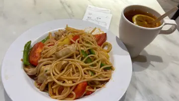观塘的食市多競爭大,价格不便宜,食市之間要爭客,廚子手艺十分重要。這家屬大廈為內部員工提供的飯堂,門牌是很難看到找到的(因為他屬不公開對戶的餐廳),要品嘗便宜又味道的,真不容易。下午茶在2点鐘開始,炒飯炒面、各種各樣的三文治,甚至小吃配飲品都给你選擇。如果你還未吃午餐的話,這是比較實恵的選擇,不過份量肯定沒有午餐的大。這蕃茄雞柳炒意大利面,蕃茄和雞肉鮮嫩美味,醬汁蓋上意大利面,鑊氣超正!再配一杯港式奶茶,下午茶絕對滿足了。