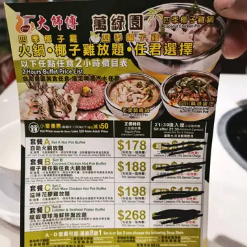 e間野好近我屋企,見佢有做椰子鷄放題,每次經過都想一試,夜晚星期六168加一,平日9:00後138加一,我星期六9:00左右入去,伙計已經吾想做,話明厨房收十點,自助區收十點半,可坐到十一點,ok,我想只系食个零鈡已經夠,飲品啤酒有幾款,醬料,丸類,菜等,其實D雞系靚的,新鮮,其他野都系急凍野,仲有冰的,吾緊要啦,雞靚都好,九點半左右就開始在你腳邊不停拖地,抹枱,地下系超級濕滑的,拖完地員工就開始躲起來,好怕你叫佢加野,直到仲有五分鐘就十點就出現,問你加咩,last order.加個嘢勁細碟。拎曬出嚟之後又再匿埋,馬上拎張單出嚟叫你嗱嗱聲埋單。之後黑口黑面喺你身邊成日拖地抹地。真係感覺超級差,如果唔想比人食真係感覺超級差,如果唔想比人食,就唔好做放題啦。我寧願去逐碟計冇咁嬲。話哂出嚟食放題食左十幾年,第一間咁小家嘅。啲夥計嘅嘴臉仲差過同佢乞。三個人食咗500幾仲要一肚氣。Read More