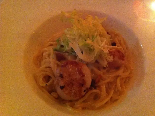 。記憶中,沙律的醋汁味道,很差勁:(。青豆三文魚湯,似菠菜湯多d。味道ok,味道不如實物,也不會太「不滿」。龍蝦湯,不是忌廉型,感覺是蝦膏+清湯造法。淡口,龍蝦味不豐富。炭燒美國穀飼豬鞍扒。豬扒很爽口,條”肥”邊,中和了豬肉本身的嚡口。吃完不用挑牙,也不會給你很肉的「膩」。加上”燒爐”味,很香。從未吃過如此滿意的豬扒:)!藍芝士松子仁鮮帶子意粉。又一驚喜之作:),藍芝士味比一般芝士意粉完全不同。那種芝士香,放在意粉上,有高一層次之感。配埋松子仁,絕對意想不到的配合!到甜品了....法式焦糖燉蛋。蛋味足夠,但欠缺法式焦糖燉蛋應有的呍哩o拿優香。與吃中式燉蛋差不多。朱古力心太軟,外皮有點濕潤,用匙壓下,很有彈性