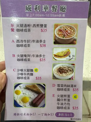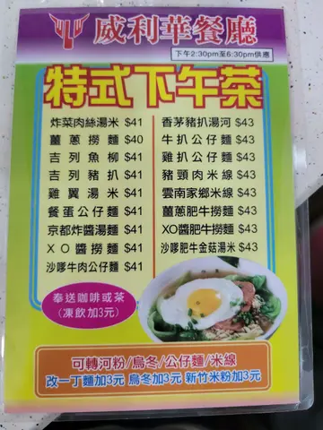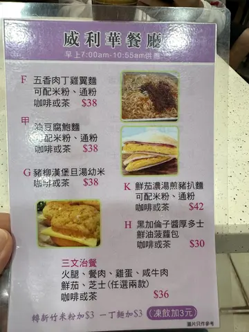 已經好耐冇試過放假落街去茶餐廳食早餐, 平時放假一般都瞓到黃朝百晏,或者有時就同老婆去麥當勞食早晨全餐。今次就去番好多年都冇食到嘅威利華餐廳,老婆話嚟咗柴灣住咁多年佢都未食過喎,所以特登帶佢嚟試一試,我自己都好多年冇食過啦,以前喺中學嘅時代我成日都嚟呢度食午飯,估唔到咁多年都冇乜大轉變, 裏面嘅裝修同以前一模一樣。但最估唔到連食物都有保持返以前嘅水準, 同其他大型連鎖餐廳嘅味道完全唔同,係一 貫香港茶餐廳嘅味道,希望香港可以保留多啲傳統及有特色嘅餐廳, 唔好只係得啲大財團嘅連鎖餐廳 ,俾市民多啲選擇。火腿通粉 & 牛油多士煎蛋沙嗲牛麵&茶走…查看更多
