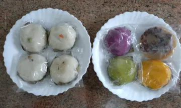 琳瑯滿目的茶果。我曾聽到「媽子」說:「我的茶果是用過濾水做的!」色彩繽紛,圓圓滾滾,十分可愛!每個茶果只要$8!茶果皮好軟熟,不會黏牙。餡料則是純粹原味,吃得出材料的原味。1) 左邊的碟 左上:鹹綠豆真的帶有鹹味。鬆散的豆蓉就如端午糉的綠豆餡。右上:蘿蔔菜甫原來是茶果型的粉果,內裏是粉果餡:蝦米、蘿白粒和花生(因為吃得太開心,所以忽略了菜甫)。雖然餡料微辣(也許加了胡椒粉),然而吃那些料附在竹葉上的餡料,會吃到荷葉(?)的清香。左下:眉豆蓉鹹鹹的,完全不帶眉豆渣,美味!右下:花生芝麻粒粒分明,芝麻炒得香!2)右邊的碟左上:紫色的紫薯紅豆不帶味道,紅豆不甜,吃到紅豆的原味。右上:砵仔糕甜度適中,頗有彈力,並非只是鬆粉!左下:翠綠的班蘭紅豆透着班蘭的幽香。紅豆餡尤如紫薯紅豆般保持原味。右下:橙色的南瓜椰絲,椰絲味好濃郁,甚至香得有點頭暈,喜歡椰絲人士一定會好喜意。我則驚訝椰絲會如此香。…查看更多