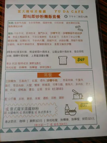 普通街坊茶餐廳,檯椅密麻麻、卡位又細張,坐得好唔舒服又勁迫夾,幸好姐姐、嬸嬸、叔叔們服務尚算殷勤啫。暴飲暴食左七日,仲未停到口,要花多一點時間調整一下,食埋個飯先講,衝呀!成個月無食靚燒味飯咯,食多餐先操啦!要食飽飽先有力操架麻,努力做運動就是為了能夠食更多珍饈百味,正呀。條街焗爐一樣,連我自己都覺得溶溶地,路過望到居然有卡位喎,是鬼但即刻衝入黎,跟住阿姐不停比壓力要我落單,最緊要快,唔諗喇。炸雞髀,香氣撲鼻、皮香肉嫩、肉質結實帶彈,夠晒滿足啦,熱騰騰好味道 ﹗切雞髀叉燒飯,多謝 $48 蚊,合理價錢。就算選擇多都係諗唔到食咩好,是但又燒味啦,富大燒味有保證無甩拖。正呀!切雞髀好好味,完全無位比我彈 ﹗切雞髀肉白雪雪又嫩嫩滑,每一口都充滿彈性,無話硬實實。薄薄雞皮黏著雞肉,甘香不油膩,肉汁瘋狂而濕潤,雞味香濃又香甜,氣味芬芳又清新,聞得到的美味 ﹗蜜汁叉燒熱辣辣,質地夠軟棉又 juicy,不會硬掘掘、不會乾爭爭,豬味濃厚,甜中帶點燋香,實在好食 ﹗惹味蔥油撞上甜豉油再撈白飯,大大味塞入口,極度滋味,好食到手都震!美味叉燒躺在蔥油甜豉油白飯上連埋嫩滑雞肉同吃,百般味道反質感在舌頭上打滾,融合得天衣無縫,堅係無得頂呀 ﹗叉燒非常香甜軟腍鬆軟,肉汁微滲,真係好好食,邊位仲有燋香味道!切雞髀燒鴨飯加煎蛋,餸仲多過飯,$50 蚊大大碟,抵食到爛,嘩哈哈!煎蛋加 $5 蚊好合理,一隻雞蛋係街市都要 $3 蚊隻,試過尖沙咀茶記加隻蛋收我十蚊,離晒譜架,您以為我大陸黎架咩 ﹗賣相有點可怕喎,求其堆埋一齊就出貨,感覺非常凌亂,知否好影響食慾架呢!唯有我親手執返靚仔,整整齊齊、企企理理影張遺照啦。豐滿的荷包蛋異常吸引,脹卜卜又肥嘟嘟,可愛非常,使人想入非非 ﹗流心蛋黃暖笠笠、軟軟棉棉、黏黏滑滑,漿住您的雙脣,緊緊包著您的舌頭 ﹗甘甜無比的蛋汁混上豉油蔥油白飯,不用半點肉、不用半點餸,淨係依隻蛋已經消滅左半碟飯喇 ﹗簡單但又最好味既就係熱辣辣煎蛋撈飯,正正正呀!好食到想咆吼呢 ﹗好少可叫普通燒鴨,而唔叫燒鴨髀食呢,突然想食下鴨胸之麻,而且富大是沒有燒鵝供應的啊 ﹗肉質不過不失啦,啖啖肉無搵笨,唔會斬晒頭頭尾尾或背脊,夠老實。味道係有點偏咸,跟飯同吃都唔係太嗆,還算合格。切雞髀燒肉飯,到依一刻先發現,原來富大最出名係燒肉囉,我係紅磡打滾左十年,捐窿捐隙搵食都從未聽過,果真孤陋寡聞啊 ﹗難怪有個個衝住黎要食燒肉啦,有幾次我想食都已經賣晒喇。燒肉仲好食過上水陳六記所謂既招牌碳燒五層樓啦,好食百倍呀 ﹗層次分明的燒肉,最上層香脆無比,黏著薄薄甘香油脂,不肥不膩牽著甜美多汁又軟棉的瘦肉,最後就是結實的咸肉。味道環環緊扣,美味可口無得彈 ﹗無論如何配搭豉油蔥油飯都極好食,香噴噴越食越精神、越食越起勁,真係停不了啊 ﹗油雞髀燻蹄飯,白切雞有點悶吧,人生要多點色彩,出黎啦 ﹗豉油雞髀 ﹗好很怕油雞浸得太咸太嗆,而且我一向都唔多咸得,幸好富大未算重手,輕輕淡淡的豉油香恰到好處,溫柔不粗暴,咸中帶甜,味道宜人。浸過豉油的雞皮較脆口又更有彈性,雞肉亦微得結實但不失嫩滑,不負眾望,有一定水準。我喜歡燻蹄配燒味有個好重要既原因,淋上甜醋非常提神醒腦又開胃呢,不過甜醋既品質、味道都好緊要,如果係外購獨立包裝既就差好遠喇,只酸不香不甜。燻蹄外皮夠膠又夠爽彈,不肥膩配上豬味濃郁瘦肉,不錯不錯。淨食點都有點寡,夾著油雞髀肉撈埋豉油蔥油飯齊齊食,即時產生化學作用,美味極致,好食到拍案叫絕。香噴噴的蔥油切得幼細,香味更能發揮得淋灕盡至,跟燒味甜豉油飯簡直絕配。回想當年對蔥油百般抗拒又反胃,真係走寶呀 ﹗切雞髀燻蹄飯,好好好味啊 ﹗我喜歡燻蹄配燒味有個好重要既原因,淋上甜醋非常提神醒腦又開胃呢,不過甜醋既品質、味道都好緊要,如果係外購獨立包裝既就差好遠喇,只酸不香不甜。燻蹄外皮夠膠又夠爽彈,不肥膩配上豬味濃郁瘦肉,不錯不錯。淨食點都有點寡,夾著切雞髀肉撈埋豉油蔥油飯齊齊食,即時產生化學作用,美味極致,好食到拍案叫絕。燒鴨髀燒肉飯,鴨髀比鵝髀細一半有多,不過比起鵝少油少肥膏,不過鵝肉緊緻幼嫩好多,肉味更濃,肉汁更勁,味道更香,所以貴好多囉。燒鴨髀皮香肉嫩,鴨皮燒得非常乾爽唔油膩,堅香噴噴 ﹗包著嫩肉一啜入口,鴨肉味濃又甜美可口,鴨油甘甜不膩,飯粒又乾爽、蔥油又香口,當然大滿足啦 ﹗頂級燒肉勁好味,脆皮勁香!香菇牛肉炆伊麵走蔥走芽菜走韮黃,唔理有定無,梗係走左先算,費事揀死我啦。全部走晒舒服晒,可以安心地大啖大啖地將伊麵掃入口,依個感覺真係堅爽呀 ﹗伊麵彈彈的,洽得剛好唔會太腍,有點趙口,生抽老抽味濃又香噴噴,不過咸又不嗆不濁,炒得鑊氣迫人,食得津津有味,不過有一半伊麵碎晒,要用羹食囉。乾炒濃味牛肉雞髀菇伊麵,都帶點濕潤,牛肉腍滑、菇爽彈,蠻滿意的,好味。黑椒牛柳絲炒意粉,中式炒意比叉我用,想揀走芽菜、洋蔥、韮黃、青蔥都幾困難喎,全部我都唔食架。實在太趕時間,求其爬晒入口算數,近年開始頂得住股草腥味唔會反胃,免強吞得到入口。估唔到有師傅有料到喎,炒得勁有鑊氣,白煙飄飄,香氣撲鼻。意粉好彈牙,牛柳絲嚥嚥韌韌,黑椒味濃又夠辣,混埋大量香菜味道滿意,而且不太油膩。咖哩牛扒意粉,咖哩夠香又