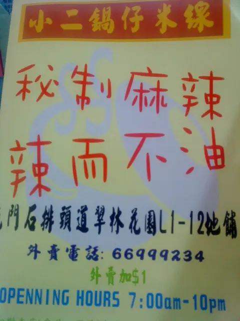 小二鍋仔米線 (屯門) 網址: https://s.openrice.com/QrbS0oMK000 地址: 香港屯門石排頭路翠林花園地下12號舖 電話: +852 6699 9234
