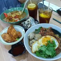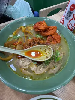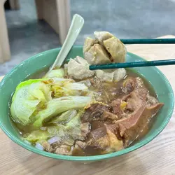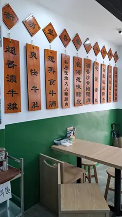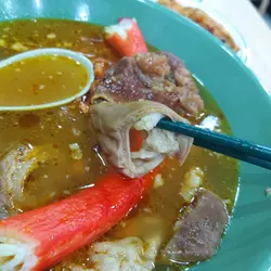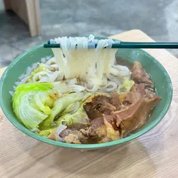 湯底是餐廳秘傳清湯,以豬骨、雞殼、雞爪熬製而成,再加入古法辣汁。不過酸齋味道太強了,導致整碗湯底都滲透它的酸,嚐不到辣感。麵底就選了河粉,質地滑溜帶少許彈牙感