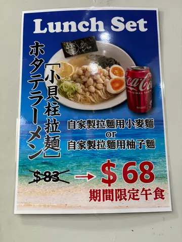 午市套餐🐚小貝柱拉麵 $68🍜可選自家製拉麵用柚子麵/小麥麵我個人係唔鍾意柚子嘅澀味但都嗌左柚子麵試吓XD麵入面有啲柚子粒食落好fresh,一啲都唔漏麵質爽口彈牙係我喜歡嘅口感(⁎⁍̴̛ᴗ⁍̴̛⁎)🥣貝柱湯底鮮甜有粒牛油🧈慢慢溶入湯底幾香,同埋有蔥無咁膩🐚貝柱粒粒煮得啱啱好微微燒香(˶‾᷄ ⁻̫ ‾᷅˵)一啲都唔韌而且份量都幾多溏心蛋都好好jap附送飲品喺香港食到日本質素仲要$68(;´༎ຶД༎ຶ`)(上次食另一間蠔拉麵得一粒蠔,麵質真係食緊細蓉咁,仲要收$138再加一 -_-)但係我哋週末去旺角店計埋我哋都係得三至四個客大家去開旺角/香港大學/屯門嘅話不妨支持下佢仲有印花卡可以草印仔ʕ •ᴥ•ʔ儲齊10個可以換指定沾麵無加一服務費Ps全自費見到有抹茶雞白湯好想試吓準備下次再去食😗😗多謝你睇到呢度🤍有興趣嘅朋友快啲share比fd一齊去啦!٩(๑>∀<๑)۶…查看更多