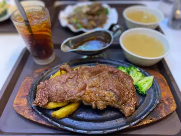 以前細個,去過唔少既港式餐廳,係先購票,後自己取餐的。是介乎快餐店同茶餐廳之間的一類型。到了今時今日,的確除了部份既工廠區飯堂,以這種模式經營的食肆,已經少之又少。但,在沙田的希爾頓中心,仍然存在一間以先購票,等叫 number ,再自己去水吧取餐,而且食物出品中西合壁的餐廳,《德興餐廳》。那天夜晚行完商場,就帶同兩個小朋友,體驗一下,讓他們了解,爸爸小時候喜歡拜訪既餐廳類型。每當有食物、飲品 ready,廚房就會嗌咪,小朋友就覺得非常之新奇。話好似唱歌咁。當我們點好餐後,拿了號碼牌,我就叫仔仔留意嗌咪,由他去負責去水吧捧餐。仔仔說,這兒似快餐店,但感覺上又似茶餐廳,佢感覺有點亂。然而,不一會,我們叫的三個餐也到齊了。而我們每人有一個例湯,是一個消暑的涼瓜豬骨湯。清清的,涼涼爽爽,是一個生津消暑的好湯水。那天,仔仔要了一份咖喱牛腩。一看就看得出,這是落了黃薑粉的港式咖喱。因為有牛腩同薯仔,所以在沒有過多的香料既襯托下也顯得香口。而且,有汁,以學生仔來說,撈飯食既絕佳物品。買給阿女的,是粟米石斑飯。同樣,是因為有汁而令女女胃口大開。甜甜的粟米及粟米汁,小朋友吃到這東西,不會不開心。再加上魚柳是脆脆的,魚肉是滑滑的。又甜又香又脆又多汁,盡顯了港式碟頭飯既風格。就算阿女堂食食唔晒,打包回家,隔天丁熱再食,依然是美味可口。我就來了一份鐵板牛扒。熱辣辣,肉香香,加了汁之後更突顯牛肉的美味道。之不過,鐵板絕對不及坊間幾家港式扒房的來得熱,淋上 Gravy 之後,並沒有出現強烈的 "渣渣" 聲。幸好,牛扒及薯菜都味道充足,好味道又夠淋。成份餐的確係好熱既,只係淋上汁之後,沒有出煙及起泡而已。飲品,是兩凍奶茶,一熱奶茶。我可以講給大家聽,三杯奶茶都非常之好飲。奶味充足,茶味香濃,我、阿仔同太太,都好滿意。好多時,就是在這些夠街坊,夠大眾化的平民餐廳,能找出令人滿意的香港味道。而這一餐的食物出品,算是夠滿意的了。一家人簡簡單單,吃得開心就是好。…查看更多