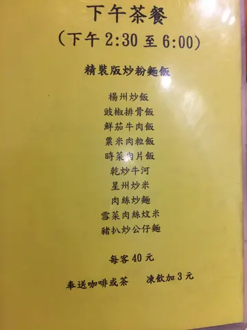 呢間茶餐廳咁多年來都一直咁乾淨企理 坐得舒服又自在留意佢D糖,辣椒油D樽咁乾淨就知 台下放碗筷既櫃都好乾淨 下午茶抵食 份量不小奶茶一流 最少俾出名既蘭記個杯又黑又苦的好好多又香又滑 又夠熱 佢杯奶茶係要嘆 炒粉麵好夠鑊氣 唔好以為下午茶無誠意好細 個炒飯都OK 唔會太油 飯亦炒得粒粒分明干牛河就係叫午餐既 大大碟 好夠鑊氣 肉亦不少 有個阿姐好好人 見我大肚 主動俾多杯熱水叫我洗餐具 街坊茶記都可以好Warm 提一提佢下午茶星期六2:30-6點都有做 值得一試