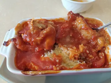 返工前係附近搵飯堂,喺附近諗唔到食乜好,揀左一間市市正正既茶記,就入去幫襯下。本來有set lunch,$42都幾抵,但唔太岩,就叫左餐牌上既焗豬扒飯,有驚喜。鮮茄焗豬扒飯蕃茄都幾新鮮,夠冧又多汁。芝士份量岩岩好,焗至溶掉,食到芝士香又唔會過籠。茄汁都OK,唔算太鹹亦唔太甜唔太酸,仲帶D鮮茄味。豬扒碎上,肉質唔錯,有D韌勁。炒飯底就不過不失,少左D蛋香味,整體水準不俗。