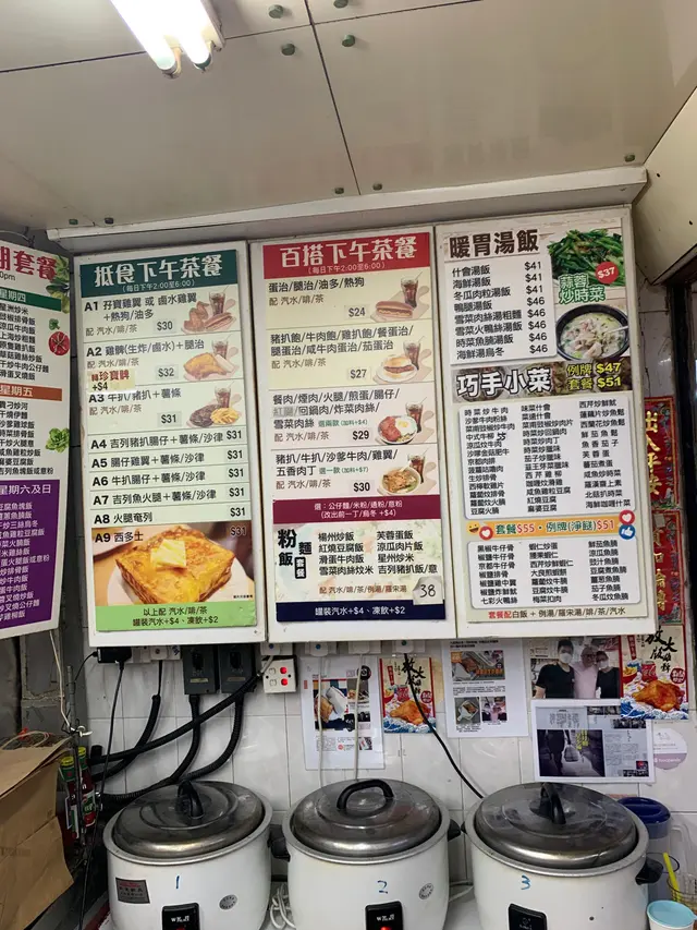 有左好多年的老牌快餐店,朋友一直都話要黎食佢個炸髀,今日見順路就會一會佢啦。門面非常傳統,沒有華麗嘅打卡點,但感覺實際。主打外賣,但有需要都可以開張折枱堂食。店內有滿滿的餐牌,價錢相當親民,其中最多人叫就係呢個熱賣星期套餐,幾乎個個黎到都係叫炒貴刁。到左下午茶時段,就係炸髀同雞扒包熱賣啦。叫左一份A2同一份A7下午茶,加埋凍飲都係67蚊,抵!