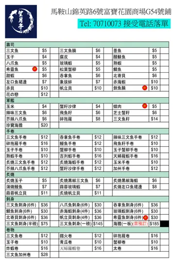 望月亭外賣壽司 (富寶花園) (馬鞍山) 網址: https://s.openrice.com/QrbS0FjW900 地址: 香港馬鞍山錦英路6號富寶花園商場地下G54號舖 電話: +852 70710073