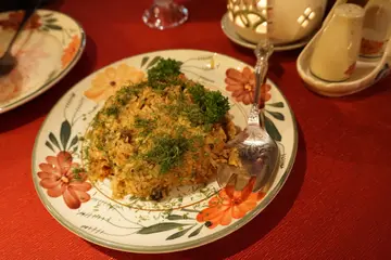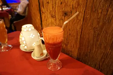 計一計, 原來, 已有八年沒有到這餐廳了. 時光飛逝, 八年前的事, 就好像是上個月發生似的.有幾個月沒見好姊妹, 於是這晚又一起搵一些特別的餐廳吃飯, 就到了這間既熟悉, 又陌生的地方, 吃一頓異國菜的晚餐.陳設裝潢沒有太大的改變, 仍然是燈光微暗, 仍然是充滿東歐氣氛的擺設, 仍然是同一個店主, 唯一不同的是, 我現在的心境, 和八年前的心境, 已經大大不同了.飲品我揀了Traditional Ukrainian fruit drink ($58), 橙紅色的凍飲, 是以多種水果的汁液混合而成, 有士多啤李, 桃, 蘋果等等, 充滿著水果的天然甜酸味道, 滿有果肉碎, 很豐富哩. 紅菜頭魚柳沙律 [Salad with beetroot, herring fish and potato carrot ($75)]的造型好像一件圓形蛋糕.「蛋糕」部份是由青魚柳碎粒及薯蓉組成. 上面鋪滿著紅菜頭粒及紅蘿蔔粒, 再加以魚子和兩片檸檬置於頂部, 然後唧上沙律醬. 事實上,我們也不知道如何吃, 是切開後伴勻吃, 還是切開一片片吃? 我們選擇了前者, 因我倆也覺得沙律醬應該要伴勻東西來吃嘛. 結果也是不錯的. 白色的沙律醬有一貫甜甜酸酸的味道, 但原來, 這樣子的味道, 和嫩滑的青魚柳碎粒很匹配. 很讚的沙律!東歐地道牛羊炒飯 [Traditional tangy rice pilaf with lamb and beef ($138)]是一道香料味極濃的炒飯. 炒飯內的羊肉及牛肉都已全熟, 尤幸質地亦不太韌. 羊肉粒的羊膻味是頗濃的, 但混合著牛肉粒一起吃, 卻產生了一種奇妙的中和作用, 讓人容易接受. 而由於飯粒吸收了香料味及肉味, 導致飯粒異常惹味誘人. 焙三文魚扒 [Skewers of salmon with avocado sauce ($168)], 即是三文魚扒串燒, 更有洋蔥及黃瓜片相間著. 正方體的三文魚扒是出奇地厚肉, 被燒過後, 外層是微脆, 但意想不到的是, 咬一啖, 竟然是肉質緊緻嫩滑, 更有肉汁四溢, 還有魚油滲出, 的確帶給我們驚喜. 不過, 要注意三文魚扒內有少許細骨, 吃的時候要小心點哦. 最後, 老闆帶領我們進入酒窖參觀, 又幫我們拍照. 很貼心的服務哩. 如此特別的環境, 如此特別的食物, 將來必定再來.…查看更多