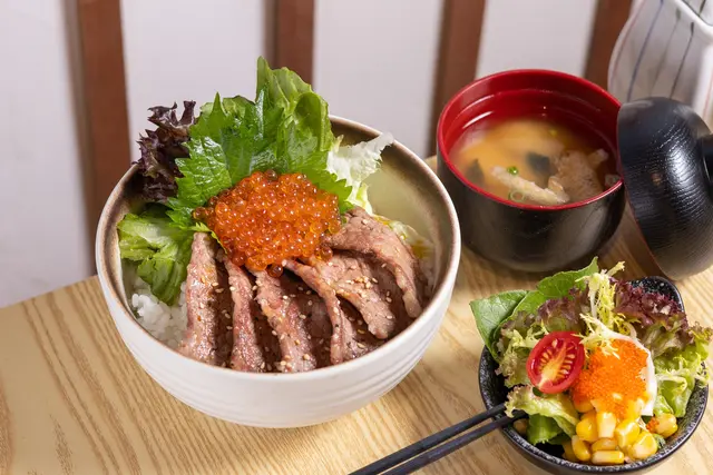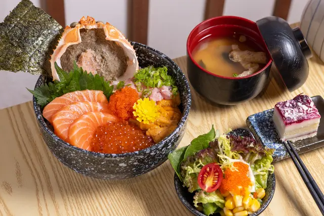 餐廳以日式紙傘、藝妓圖案等日本元素裝飾牆身,色彩豐富;供應的日式料理以親民價丼飯及刺身為主,另有不同的熟食可供選擇。