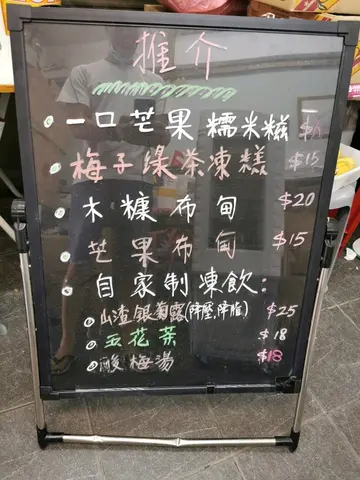 尋日入長洲玩,咁o岩平時食開o既天然甜品無開,就轉o左食呢間。我一心諗住食芒果涼粉,點知老闆娘話無;算啦,咁要芒果西米露啦,老闆娘話西米露得熱o既;極之無奈,點會連呢兩樣咁基本o既甜品都無o架?當我死死地氣再睇餐牌時,老闆娘又開口:「凍o既得返豆腐花,而且得最後一碗!」講完仲指指個雪櫃,果然,雪櫃入面除o左一碗豆腐花之外咩都無......無計啦!唯有叫個芒果豆腐花。o的豆腐花食落都o.k,有少少豆味,但係......o的芒果真係酸到爆囉!我已經比好多人食得酸o野,但都係接受唔到,酸到忍唔住縐哂眉!成世人都未食過咁酸o既芒果!雖然$11係幾平,但都唔係咁o既質素o卦?呢個價錢,長洲有好多舖頭好過佢!至於朋友叫o既木糠布甸,味道唔錯,但正如上篇食評所講,o的口感好怪。仲有個朱古力糯米糍,無咩餡不特止,口感又比較硬,奇華o個o的好過佢多多聲。$10三個,我同朋友一人一個,完全無意慾食埋淨低o個個,結果又浪費食物......不得不提o既係,由我同朋友坐低開始,老闆就無停過咁洗o野抹o野,仲要好似有心趕客咁,整到o的o野勁嘈。結果我o地頂唔順o的噪音,唯有快o的食完走人......下次點都唔會再幫襯啦!