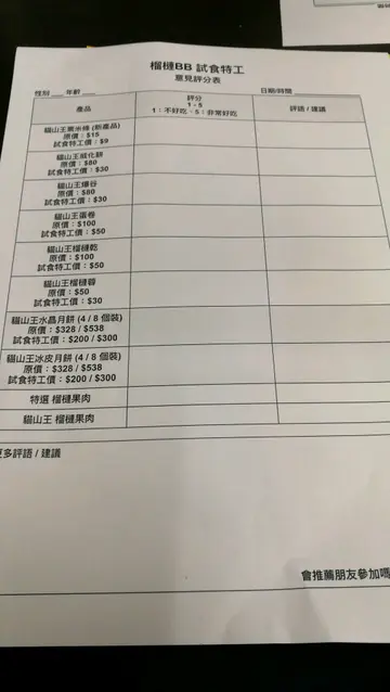 8點鐘試食,店內有2部夾公仔機,一坐低,檯面就有呢個意見評分紙,餐具,同埋2個代幣比你夾公仔,好可惜我同家人都夾不到公仔能看得出店主是想改善他們的產品由12點方向順時針分別是:榴連蓉、威化餅、爆谷、榴連乾、栗米條,中間個碗是蛋卷超好吃😋比5分「特選」個個是沒有分品種的,但都好好吃,好濃🥰貓山王不用說啦😍😍 上半是冰皮月餅下半是水晶月餅個人喜歡冰皮多一點,榴連味香好多水晶月餅就煙un點忍不住買多罐榴連蓉回家!