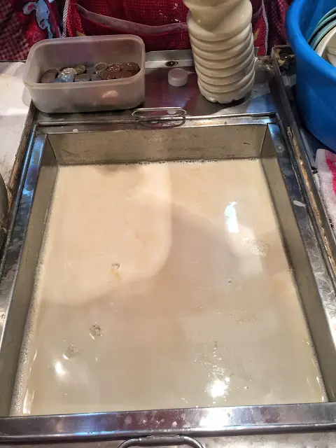 觀塘朋友介紹,話永興唔係晚晚開,今晚好彩俾我地遇上佢地開。食左碗豆漿溝豆腐花,本人唔鐘意加太多糖,我只係加左少少薑糖水,更加食得出佢地既豆香,豆腐花好滑,襯埋豆漿真係一絕。見到隔離台有人食油炸鬼,就叫左一條,油炸鬼唔似用萬年油炸,顏色金黃新鮮,只可惜有d林同凍,可能剛炸起會好d,同埋如果你係用黎浸落豆漿度食,咁都ok。豆腐花同豆漿就真係強力推介!查看更多