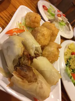 同埋個湯匙太大好難潷湯。冬陰公酸味重過辣味,無香茅味,料唔多,一般。肉碎豆腐粉絲湯無粉絲,我無飲,花先生表示無乜味。炸蝦餅,炸粉唔算厚,但無蝦味。春卷,皮脆多料。