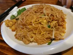 藍地大街上有間泰國菜。午餐都好多人。選擇算多有裝飾的午餐有13款,包飲品,好平。泰式金邊粉,好大碟,雞肉,雞蚕,葱段,好幼身的金邊粉,炒得幾香,雞蛋絲好味,雞肉也是。泰式蟹肉炒飯,少少蟹肉係飯面,有蛋,葱粒,炒得乾身,好味,唔濃味。炒椰菜苗,鮮甜新鮮爽口香脆,正!!蒜蓉包,好香,金黃香脆,厚度啱啱好,好好味。地方不大,服務幾好的,有效率,食物也是有水準的呀!! 還有門口的位置,環境幾舒服,也幾靚!!