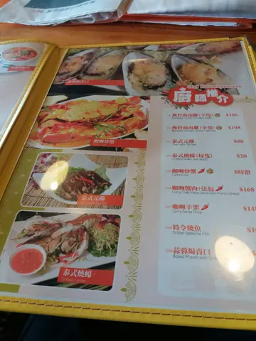芒果沙冰 / 招牌菜式泰美味炒辣蟹 / 泰式肉碎生菜包 / 泰式海南雞 / 泰式魚餅 / 椰汁西米糕