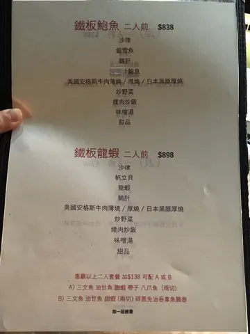 之前食過晚餐覺得非常抵同好味!! 知道午市套餐價錢梗加超抵, 質素同晚餐一樣材料咁好, 出面嘅一人價錢就可以係呢度食到質素好嘅二人餐~ 所以經常再去幫襯~因為想食鵝肝同鮑魚, 所以叫咗個鮑魚鐵板餐($338二人前)~1) 套餐入面首先送上前菜沙律, 味噌湯~2) 之後係我至愛鵝肝多士, 好脆, 唔會太油, 好美味!!3) 跟著係銀雪魚配埋底d綠色香草汁, 肉質好滑, 無魚骨, 好好味~4) 再黎我嘅至愛海膽汁鮑魚, 一大隻兩人份, 多肉, 好爽口好好味!!5) 美國安格斯牛肉薄燒好香!!6) 最後係炒菜同煙肉炒飯~甜品當然唔少得雪糕(綠茶或芝麻)~一人價錢食到兩個人份量, 好食得黎又超級抵!!