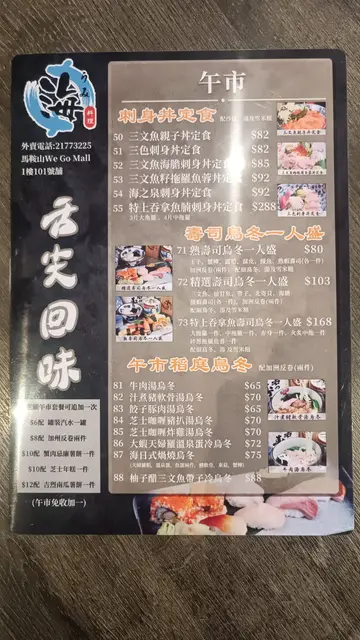 海日式料理 (馬鞍山) 網上訂座即賺Rice Dollars 網址: https://s.openrice.com/QrbS0YCiB00 地址: 香港馬鞍山保泰街16號We Go Mall 1樓101號舖 電話: +852 21773225