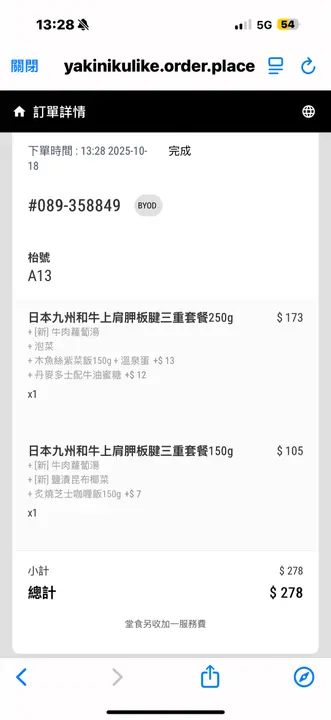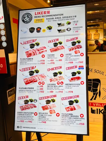 好食,惹味,正環境:❤️🩷🧡整體裝潢唔錯,簡單得黎有重點,感覺到係食燒肉既地方,亦感受到和風。1人坐位稍微有d迫,普遍香港人體型還可以,如果係健壯d,外國身形就轉個身都驚整親隔離,又怕d侍應出出入入,係背脊後行黎行去咁衛生:❤️🩷🧡💛地面感覺有d油,少少滑,座位底放袋感覺唔太乾淨,枱面很乾淨,亦見到每次有客人食完野會有人有一組工具去專門清潔其位置,感覺幾好氣氛:❤️🩷🧡💛店舖飯點都會坐滿人,熱鬧。員工工作效率唔錯,整體氣氛都幾好服務❤️🩷🧡一般般,冇話好好,基本野做齊,但本人覺得香港比較年輕一輩既服務業普遍水準都降低,所以呢度已經唔錯喇食物:❤️🩷🧡💛💚肉類份量對於貪吃既我黎講唔太夠☺️如果叫餐必須多點幾樣,但我幾鐘意佢可以係餐內加唔同既食物,加多份肉又得,我最鐘意加紫菜飯,真係好食,比牛角更好食,仲要相對平少少