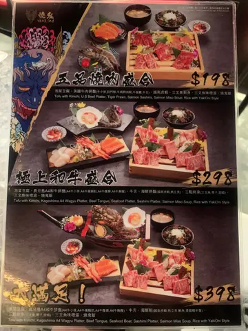 午市定量燒肉套餐!午市仲有7折優惠!銅鑼灣燒肉餐廳 燒鬼 室內裝修以暗黑系和風為主,紅黑設計十分突出,充滿日本玩味!大滿足:泡菜豆腐、鹿兒島A4和牛拼盤(A4牛小排、A4牛橫膈肌、A4牛腹、A4牛胸腹)、牛舌、海鮮船(越南虎蝦,帆立具、鮑魚、青龍蝦半隻 )、三點刺身(三文魚,帶子、甜蝦)、三文魚味噌湯、燒鬼飯極上和和牛盛合:泡菜豆腐、鹿兒島A4和牛拼盤(A4牛小排、A4牛橫膈肌、A4牛腹、A4牛胸腹)、牛舌、海鮮拼盤(越南虎蝦,帆立具)、三點刺身(三文魚,帶子、甜蝦)、三文魚味噌湯、燒鬼飯其實兩個套餐只係差$100,食物上嘅分別係海鮮多了鮑魚、青龍蝦半隻,所以大家可以自行選擇不同套餐!我自己個人覺得極上和和牛盛合已經好夠食,折扣後$200頭已經可以食到和牛真係幾吸引!鹿兒島A4和牛拼盤件件都肉色粉嫩,雪花分布平均,入口柔軟,鮮嫩多汁!另外,我幾鐘意佢個燒鬼飯,面層和牛、紫菜,加入生蛋拌飯,超好食!…查看更多