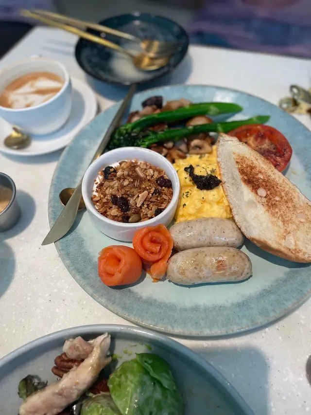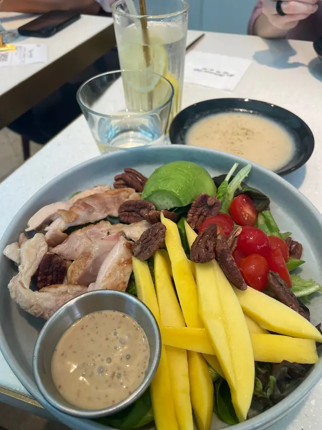 葵青劇院附近吃的很多,但個人最喜歡約這一家,有朋友在附近返工,加上這家環境、食物和價錢都合適,因此經常來吃。個人很喜歡烤雞沙律,配料豐富營養,但是雞肉貌似是預制好從一個大塑料盒裡拿出來的,不是特別新鮮,配上那個胡麻醬也很一般。牛油果和核桃我很喜歡。朋友點了全日早餐,很豐富也好吃。
