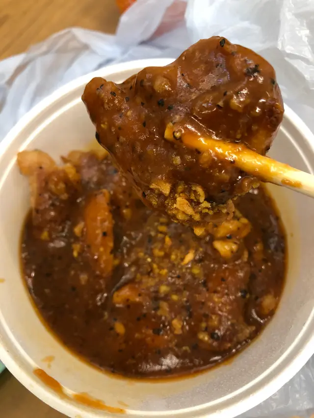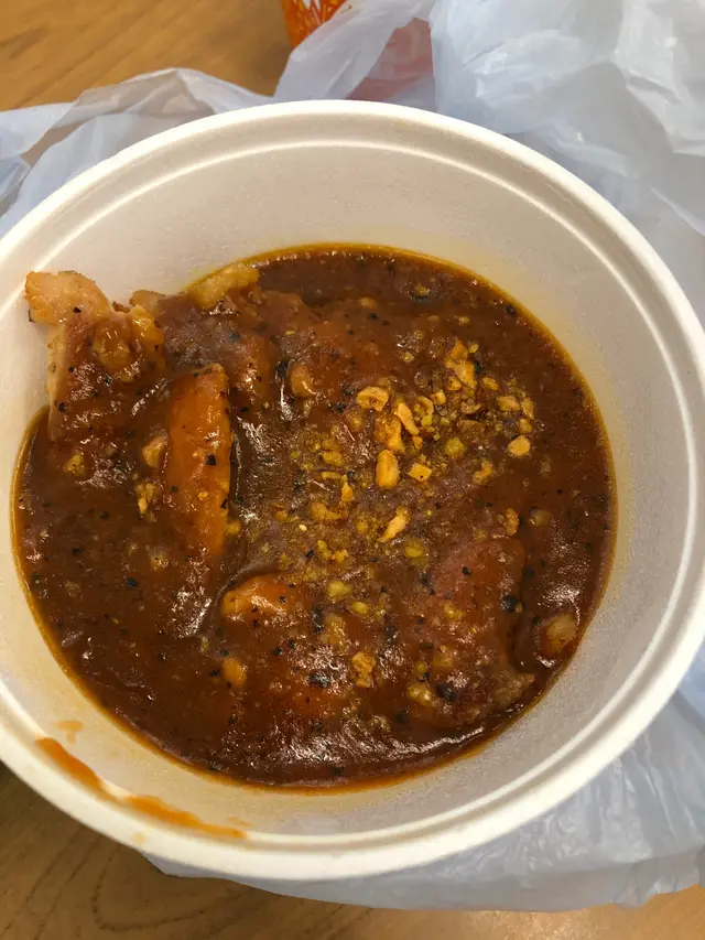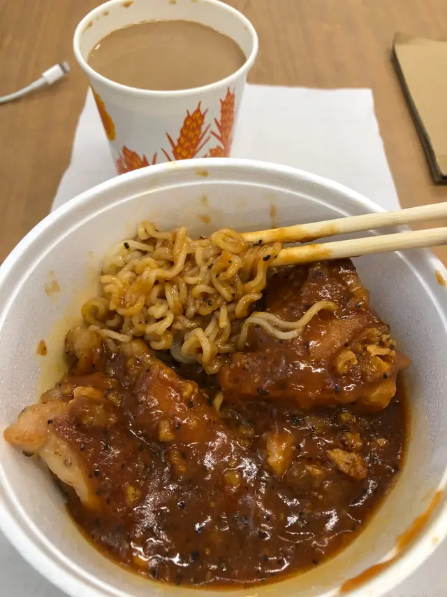 上月第一次嚟食午飯,覺得唔錯,今日再嚟幫襯外賣,試吓其他食物,係咪一樣都咁掂。今次試咗兩款,都係粉麵類:撈得起雞扒撈公仔麵(黑椒汁 )$35打開盒蓋,見到嚇一跳,黑椒汁勁多。公仔麵黐埋一舊,只能挑鬆上層,下層好難完全同黑椒汁撈匀,最終要加熱水,變咗黑椒湯雞扒公仔麵。覺得黑椒汁太鹹同公仔麵唔夾😟常餐$32~沙嗲牛肉米線,配火腿絲奄列牛油方包呢個味道正常,沙嗲味唔覺好出,而牛肉食唔到有鬆肉粉味。絕對價錢取勝查看更多