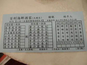 百利海鮮酒樓 (大埔) 網址: https://s.openrice.com/QrbS00qC000 地址: 香港大埔運頭塘村運頭塘商場1樓9號舖 電話: +852 2657 7368