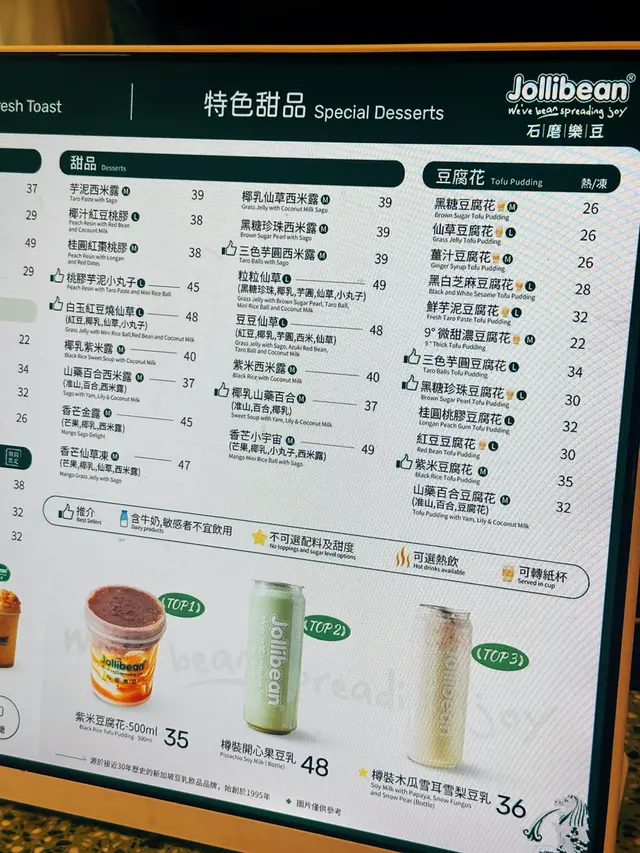 想食啲清新得嚟又唔油膩? 最近去咗 Jollibean 石磨樂豆(德福店),完全被佢哋嘅新品吸引住!呢間從新加坡引入嘅豆品專門店,一直主打每日石磨、無添加、健康又滋味~聽講創辦人喺旅程中愛上呢個有超過三十年歷史嘅品牌,欣賞佢哋每晚浸豆、每日煮豆嘅堅持,就好似香港人咁拼搏不屈。結果決心將呢份「健康輕食」文化帶返香港,仲自設咗5000呎廠房,用台灣全自動磨豆機做出一杯又一杯新鮮香濃嘅豆乳。 ✅ **香芒金露** — 一入口就係滿滿夏天氣息,芒果香甜濃郁,配上晶瑩西米露,口感層次好豐富!香芒系列仲有「香芒小宇宙」同「香芒仙草凍」,絕對啱晒芒果控~ ✅ **仙氣凝露(山藥百合西米露)** — 啖啖滋潤感!山藥滑潤、百合清香,飲完真係feel到「養顏+去火」,而且唔會太甜,啱晒注重健康又愛甜品嘅你。山藥百合系列仲有「准山百白豆腐花」同糖水款式,夠晒養生。 ✅ **茉莉花茶豆乳** — 茉莉花香清新自然,豆乳順滑又柔和,入口之後啖花香喺口腔慢慢散開,係一種好療癒嘅味道。 ✅ **開心果豆乳** — 真係要畀個👍!香濃開心果香融合豆乳甜香,濃郁之餘又唔膩,飲完仲有少少堅果香韻留喺喉嚨。 🔥【德福店小食推介】 除咗豆品,德福分店仲有即叫即整嘅 **魚蛋燒賣**!配上自家秘製醬汁,鹹香入味得嚟仲帶少少甜辣,惹味度爆燈~鍾意食辣嘅朋友真係唔可以錯過! ☕【暖心熱飲選擇】 天氣凍嘅日子,可以揀返杯 **好立克豆乳** 或者 **9° 招牌微甜豆乳**,香氣濃郁、甜度啱啱好~或者來碗熱豆花,暖笠笠又好滿足。 🌿【品牌初心】 Jollibean 一直強調「食野唔只為醫肚,仲要食得有營養、有味道」,希望大家喺繁忙都市中都能夠搵到一點溫柔嘅喘息時光。佢哋保留咗新加坡傳統風味,同時揉合香港特色,仲會定期推出季節限定餐目,讓你每次都可以試到新驚喜~成個理念就係:「Jolli + bean = spread joy through soy-based products」,以療癒美食傳遞幸福感。 …查看更多