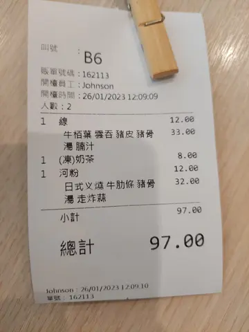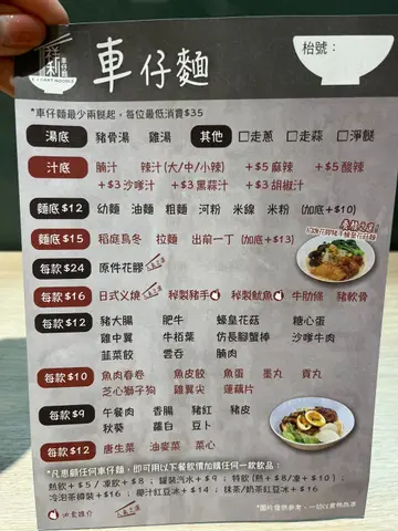 午市堂食。入座前已落單。5分鐘後俾張印單我。印單後再等25分鐘先有麵到。唔計等位時間,食車仔麵落單後要等30分鐘,效率之高應該可以冠絶呢個界别。與飯腳分别叫咗豬骨同雞湯,加腩汁,油麵。豬皮,蘿蔔,大腸,魚蛋,雞翼,魚皮餃。兩款湯嘅共同之處都係冇乜味,亦唔襯車仔麵。油麵質地似日式拉麵多過似正常油麵。好同意樓上所言,d 大腸同雞翼都滷得好深色好靚,但係其實接近完全冇味。魚蛋質地ok, 但係都係冇乜味,除咗雪味。豬皮味正常,不過好淋同得好少。魚皮餃正常,蘿蔔嘅質同量都好。可讚嘅係店員好有禮貌,亦令呢間食肆更加唔似一間車仔麵檔。