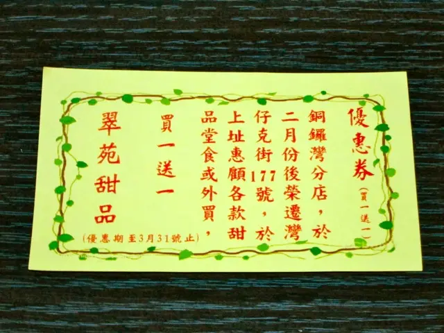 翠苑甜品專家 (銅鑼灣) 網址: https://s.openrice.com/QrbS0O3O000 地址: 香港銅鑼灣波斯富街83號C舖 電話: +852 2881 0520